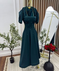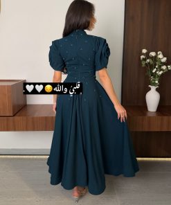الفستان يتميز بلونه الأخضر الداكن الراقي، وهو مصمم بأسلوب أنثوي أنيق. يتميز بياقة مربعة تعطي مظهرًا كلاسيكيًا، مع أكمام قصيرة ومنتفخة تضيف لمسة عصرية ورومانسية.
