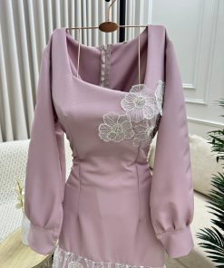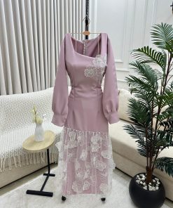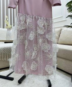 فستان باللون الوردي الفاتح مع أكمام منتفخة وتفاصيل بارزة على الصدرية. تتميز بتصميم أنيق ومميز مع طبقات من الدانتيل والورود في الجزء السفلي