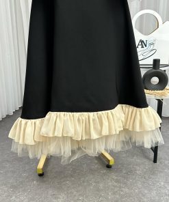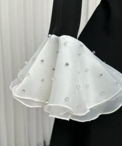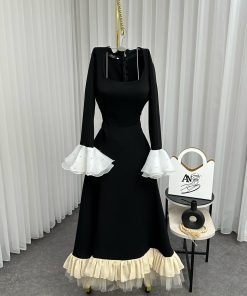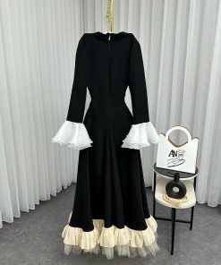 فستان أنيق وجذاب باللون الأسود مع تصميم كلاسيكي أنثوي. يتميز بقصة ضيقة عند الخصر وتنورة واسعة تنسدل بانسيابية، مما يضفي لمسة راقية ومميزة. الأكمام الطويلة مزينة بأطراف من القماش الأبيض المنفوش والمطرز بحبات لامعة، مما يضيف لمسة فخمة ورومانسية. كما أن حافة الفستان مزينة أيضًا بالكشكش الأبيض، مما يمنحه مظهرًا متوازنًا بين الأناقة والفخامة. هذا الفستان مناسب للمناسبات الخاصة والحفلات بفضل تصميمه الجذاب والراقي.