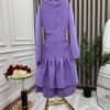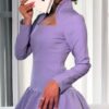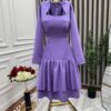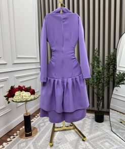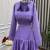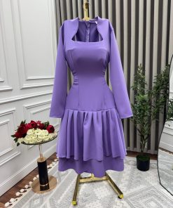 الفستان أنيق وعصري بلون موف هادئ، يتميز بتصميم جذاب يجمع بين القصات الكلاسيكية واللمسات العصرية. الجزء العلوي ضيق بأكمام طويلة مع فتحة رقبة مربعة وعصرية تمتد إلى الأكتاف، مما يضفي لمسة أنثوية راقية.