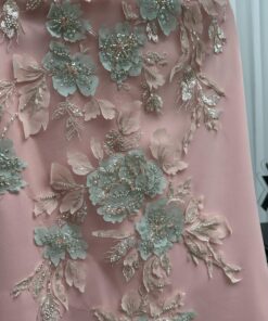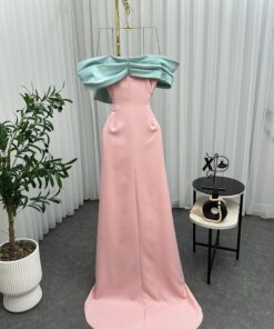 فستان ناعم أنيق طويل بارد، مزدان بتطريزات دقيقة ولمسة ثلاثية الأبعاد مناولة وضياء، تضفي طابعًا راقيًا وفخمًا. تتميز بتصميم بككش واسع من القماش الأخضر نعناعي تلتف حول الأكتاف بشكل درامي مثل العقدة، ما يضفي لمسة من الفخامة والأنوثة. وتعمل مصمم بقصة انسيابية، تبرز جمال القوام برقي، وهو مثالي للمناسبات الرسمية وحفلات الاستقبال.”