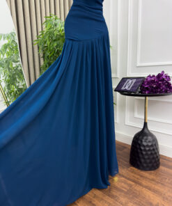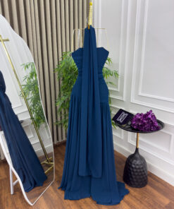 فستان أنيق بلون أزرق داكن، بتصميم راقٍ وجذاب. يتميز بقصة ضيقة عند الخصر تبرز القوام، مع ياقة مكشوفة تلتف حول الرقبة بتصميم “هالتر” أنيق.