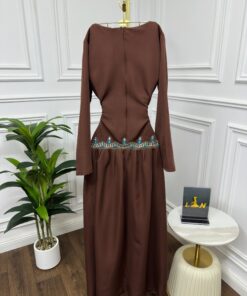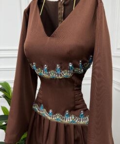 فستان أنيق بلون بني دافئ وتصميم راقٍ يجمع بين البساطة والفخامة. يتميز بياقة على شكل حرف “V” تمنح إطلالة أنثوية ناعمة، مع أكمام طويلة تضفي عليه لمسة كلاسيكية.