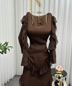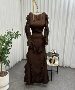 فستان طويل بلون بني داكن، بتصميم أنيق وراقٍ. يتميز بأكمام طويلة مزينة بحبات اللؤلؤ عند المعصمين، ما يضفي لمسة فاخرة. القَصّة ضيّقة عند الخصر وتنسدل بتنورة واسعة مزينة بكشكش متدرج على الجوانب وفي أسفل الفستان، مما يمنحه مظهراً جذاباً وحركة انسيابية. الياقة ذات شكل ناعم مع تفاصيل بسيطة تضفي لمسة أنثوية راقية. التصميم يجمع بين الفخامة والعصرية، ما يجعله مناسبًا للمناسبات الأنيقة.