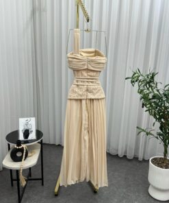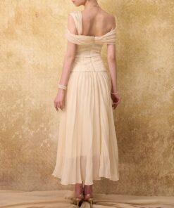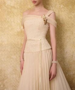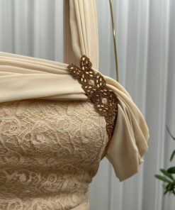 فستان أنيق وناعم بلون بيج فاتح، يتميز بتصميم كلاسيكي مستوحى من الطابع الرومانسي. الجزء العلوي مصنوع من قماش مزخرف ومزين بتطريز خفيف، مع أكمام مكشوفة تنسدل بشكل ناعم على الأكتاف، مما يضيف لمسة أنثوية راقية.