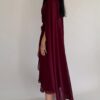 أكثر ما يميزه هو الأكمام الطويلة المصنوعة من قماش شفاف وخفيف، تنسدل بشكل فضفاض لتضيف لمسة من الفخامة والانسيابية للحركة. الياقة مستديرة وبسيطة، مما يجعله خيارًا أنيقًا لمن تبحث عن إطلالة كلاسيكية وراقية.