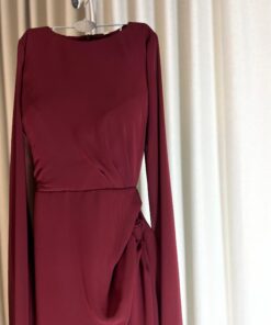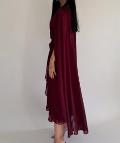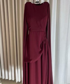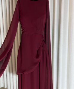 أكثر ما يميزه هو الأكمام الطويلة المصنوعة من قماش شفاف وخفيف، تنسدل بشكل فضفاض لتضيف لمسة من الفخامة والانسيابية للحركة. الياقة مستديرة وبسيطة، مما يجعله خيارًا أنيقًا لمن تبحث عن إطلالة كلاسيكية وراقية.