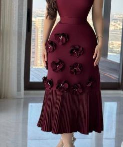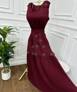 فستان أنيق بلون جميل مصمم بقصة ضيقة عند الخصر ليبرز القوام، ثم يتسع قليلاً عند الأسفل. يتميز بتفاصيل فريدة مثل الزهور ثلاثية الأبعاد المزينة بحبات اللؤلؤ، والتي تنتشر على الكتف والجزء الأوسط والسفلي من الفستان. كما أن الحاشية السفلية مصممة بكسرات تضيف لمسة راقية وحركة جميلة عند المشي. الفستان بلا أكمام وبياقة دائرية بسيطة، مما يجعله مثاليًا للمناسبات الرسمية والسهرات.