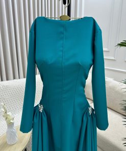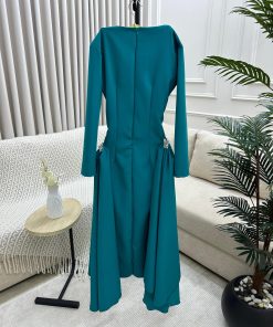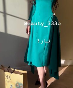 فستان أنيق وبسيط، بلون أخضر زمردي جذاب. يتميز بقصة ضيقة من الأعلى مع خصر محدد ليعطي مظهرًا أنثويًا جذابًا، ثم يتسع قليلًا من الأسفل ليضفي لمسة كلاسيكية راقية.