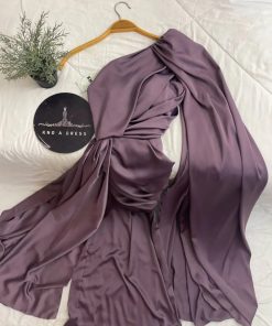 فستان مناسبات الحرير الفخم بلون جميل بقصة مليئة بالتدخيلات والكسرات المموجة شيء لايمكن وصفه
