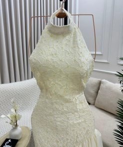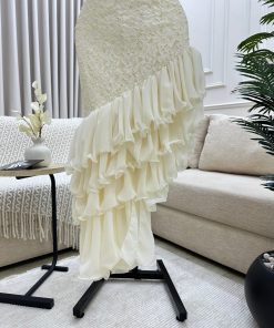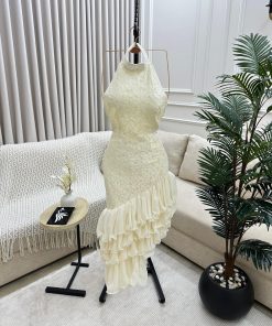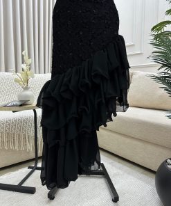 فستان أنيق باللون جميلة، بتصميم عصري وجذاب. يتميز بياقة مرتفعة على شكل هالتر  بدون أكمام، مما يمنح مظهرًا أنثويًا راقيًا. الجزء العلوي مزين بتطريزات فاخرة تضيف لمسة من الفخامة، بينما الجزء السفلي مصمم بطبقات من الكشكش غير المتناظر، مما يضفي حركة ديناميكية ولمسة درامية جذابة. التصميم يجمع بين الأناقة والكلاسيكية، ما يجعله مثاليًا للمناسبات والسهرات الراقية.