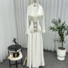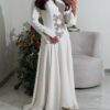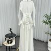 فستان يتميز بتصميم أنيق وناعم باللون الأبيض، مما يمنحه طابعًا راقيًا ومناسبًا للمناسبات الفخمة. يأتي بقصة قميصية من الأعلى مع ياقة كلاسيكية وأكمام طويلة واسعة عند الأطراف، مما يضفي لمسة أنثوية جذابة.