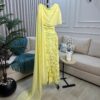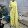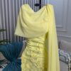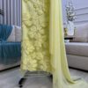 فستان سهرة فاخر باللون الأصفر الباستيل يعكس إشراقة وأناقة لا مثيل لها. يتميز التصميم بقماش شيفون انسيابي مع كتف واحد منسدل بطريقة راقية، يضفي لمسة ملكية على الإطلالة. الفستان مزين بتطريز يدوي بارز على شكل ورود ثلاثية الأبعاد تمتد على طول التصميم، مما يمنحه بعداً جمالياً أنثوياً فريداً.