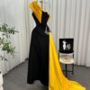 فستان مناسبة فاخر بتصميم أنيق يجمع بين الأسود الكلاسيكي و الأصفر الملكي لإطلالة تخطف الأنظار. يأتي الفستان بقصة كتف واحد (One Shoulder) تضفي لمسة عصرية، مع تطريز يدوي فاخر بألوان فضية وخضراء يمنح بريقًا جذابًا عند الإضاءة.