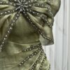 يبدأ بكتف واحد مزينة بكشكة ممتلئة من الزجاجة بصريًا أنثويًا، بينما يتوسط الجزء العلوي تطريز فخم من الخرز والكريستال لايت، مرسوم تقريبًا على شكل خطوط متداخلة فكرًا خاصًا دراميًا راقيًا. أما الخصر، فهو مشدود بانسيابية، مما يبرز القوام ويضفي قراءة من التراث.