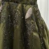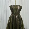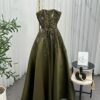 فستان يتميز بالأناقة والرقي. لونه أخضر زيتوني ، مصنوع من قماش فاخر يبدو ناعماً وذو لمعة خفيفة. تصميمه بدون أكتاف (سترابلس)، مع قصة ضيقة من الأعلى تبرز تفاصيل الخصر قبل أن يتسع بتنورة طويلة واسعة تصل للأرض، مما يعطي مظهراً ملكياً جذاباً.