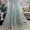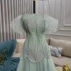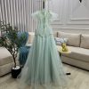 فستان سهرة أخضر نعناعي بتطريز لؤلؤ وتول ناعم تصميم فاخر بإطلالة أنثوية راقية