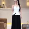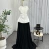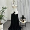 أضيفي لمسة من الفخامة على إطلالتك مع فستان سهرة أسود وأبيض فاخر يجمع بين الأناقة الكلاسيكية والتصميم العصري المبتكر. يتميز الفستان بجزء علوي من القماش الأبيض الحريري بتفاصيل فضية لامعة على الأطراف تضفي لمسة فاخرة، بينما يأتي الجزء السفلي باللون الأسود الطويل الانسيابي الذي يمنحكِ مظهراً جذاباً وراقياً.