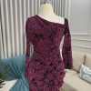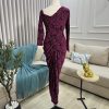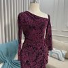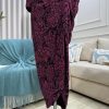 فستان سهرة عنابي بنقشة سوداء تصميم أنيق بقصة انسيابية للمناسبات الراقية
