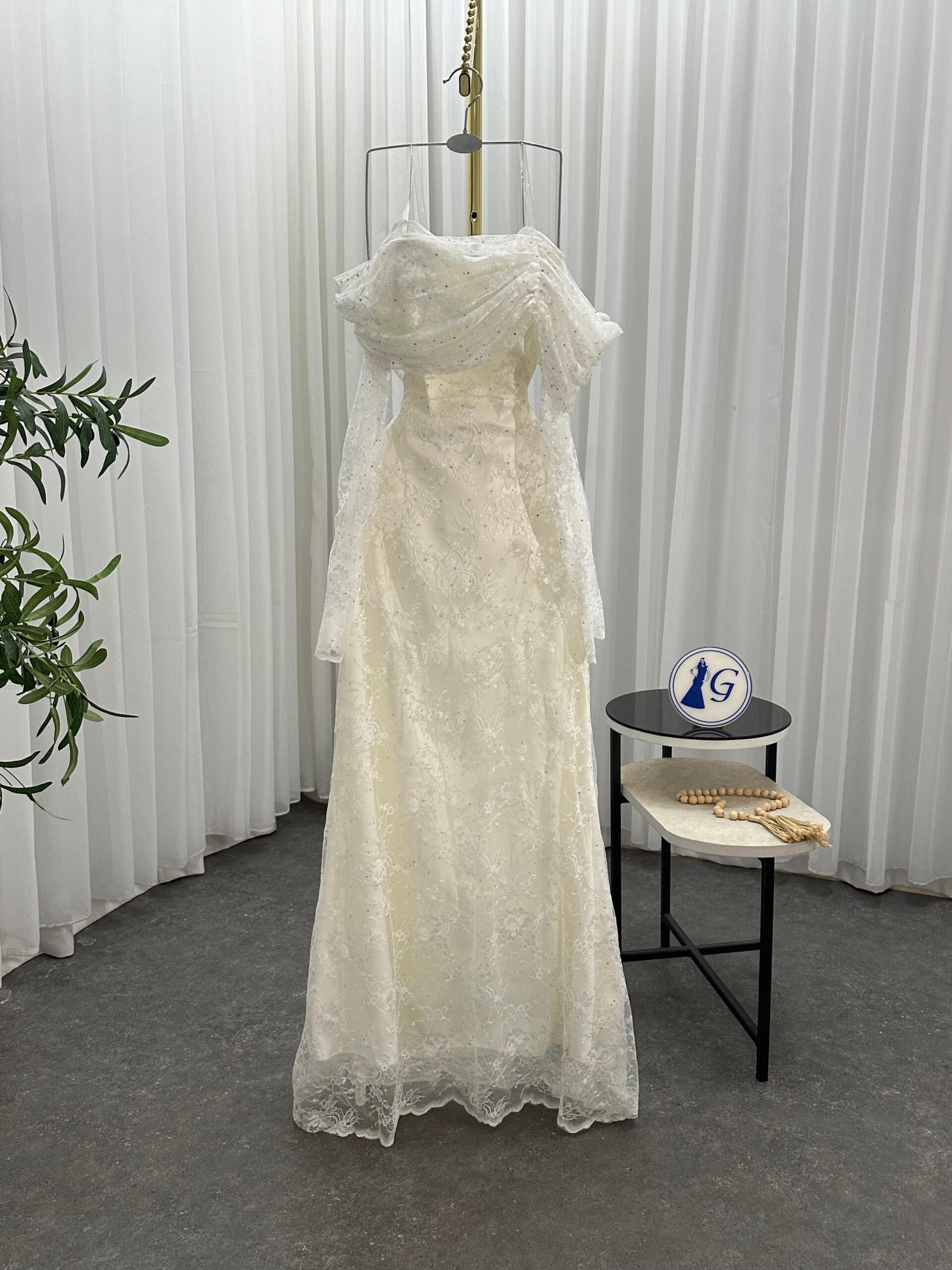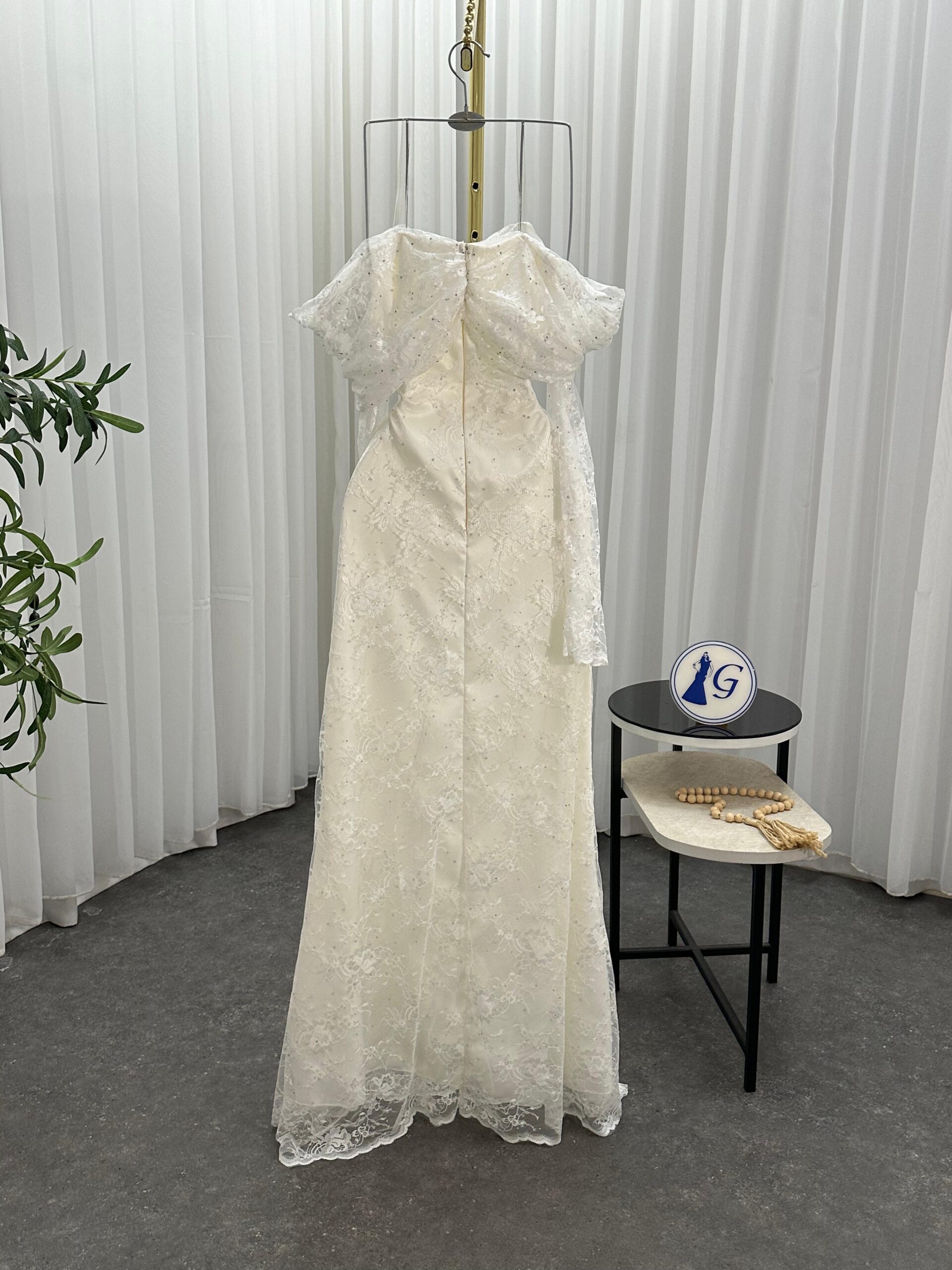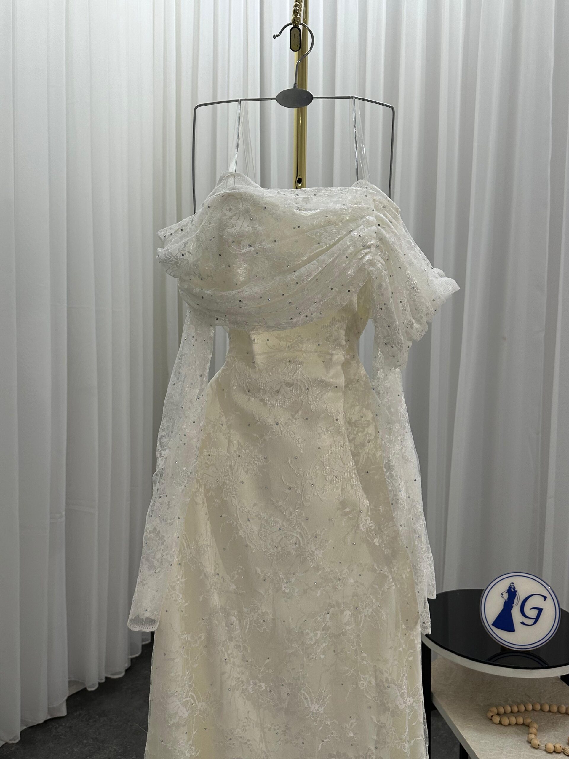 هل تبحثين عن فستان العمر الذي يجمع بين الرقي والجمال؟ إليكِ هذا الفستان الأبيض بتفاصيله الفاخرة وقماشه المزخرف بالدانتيل الناعم. تصميمه الأنيق مع الكتف المنسدل يمنحكِ إطلالة ملكية في ليلة زفافك أو مناسباتك الخاصة.