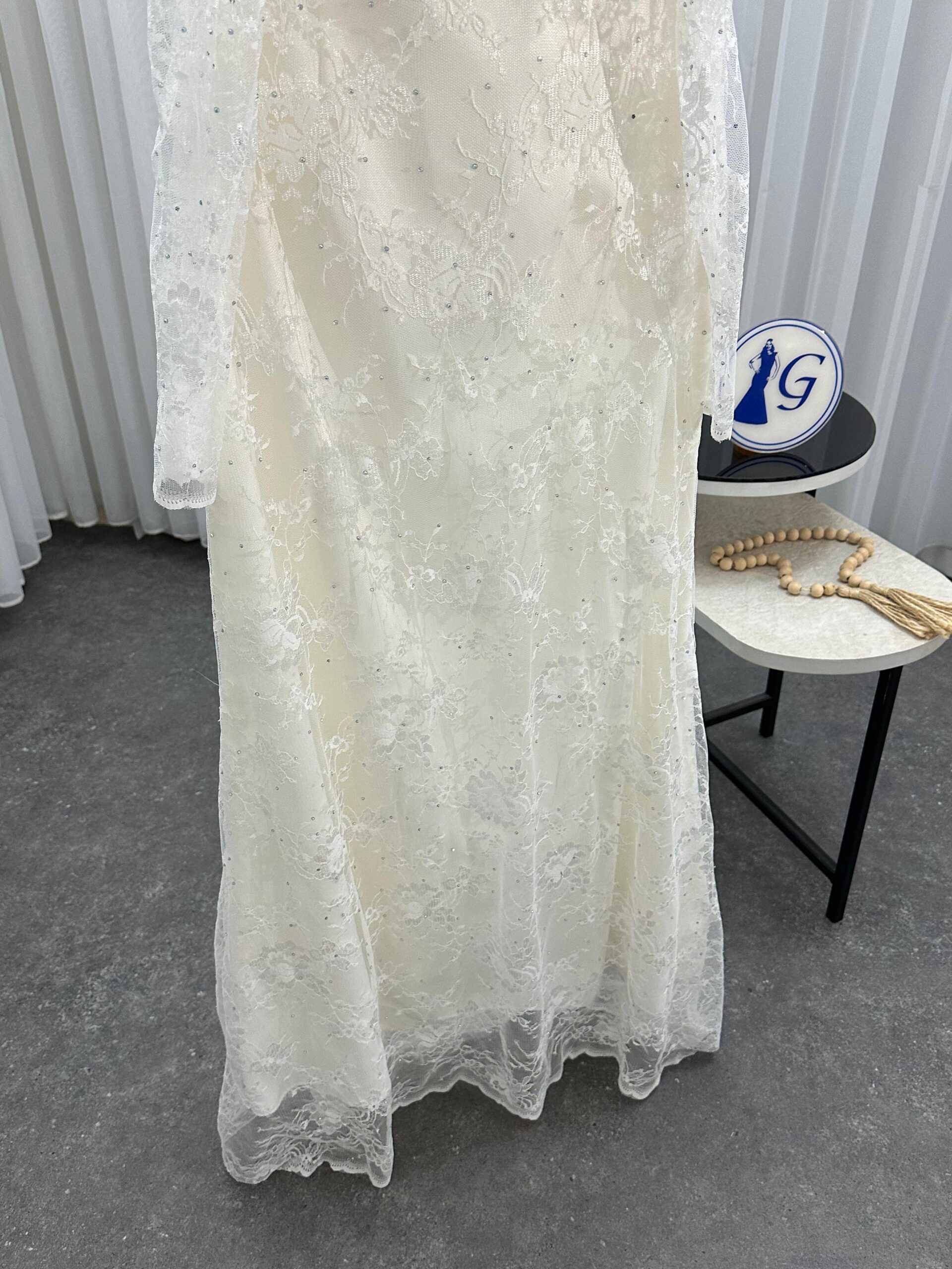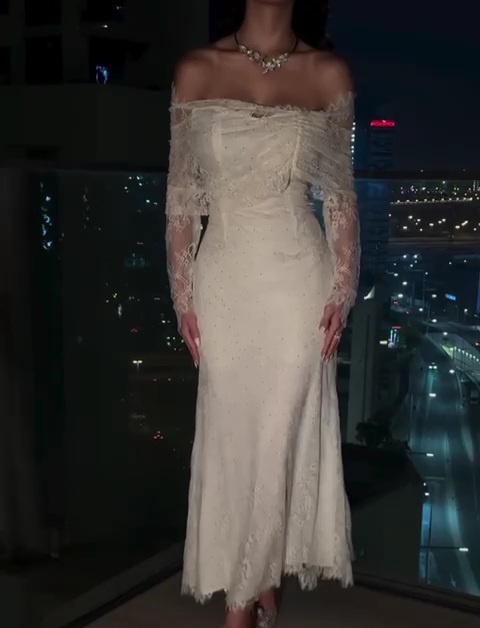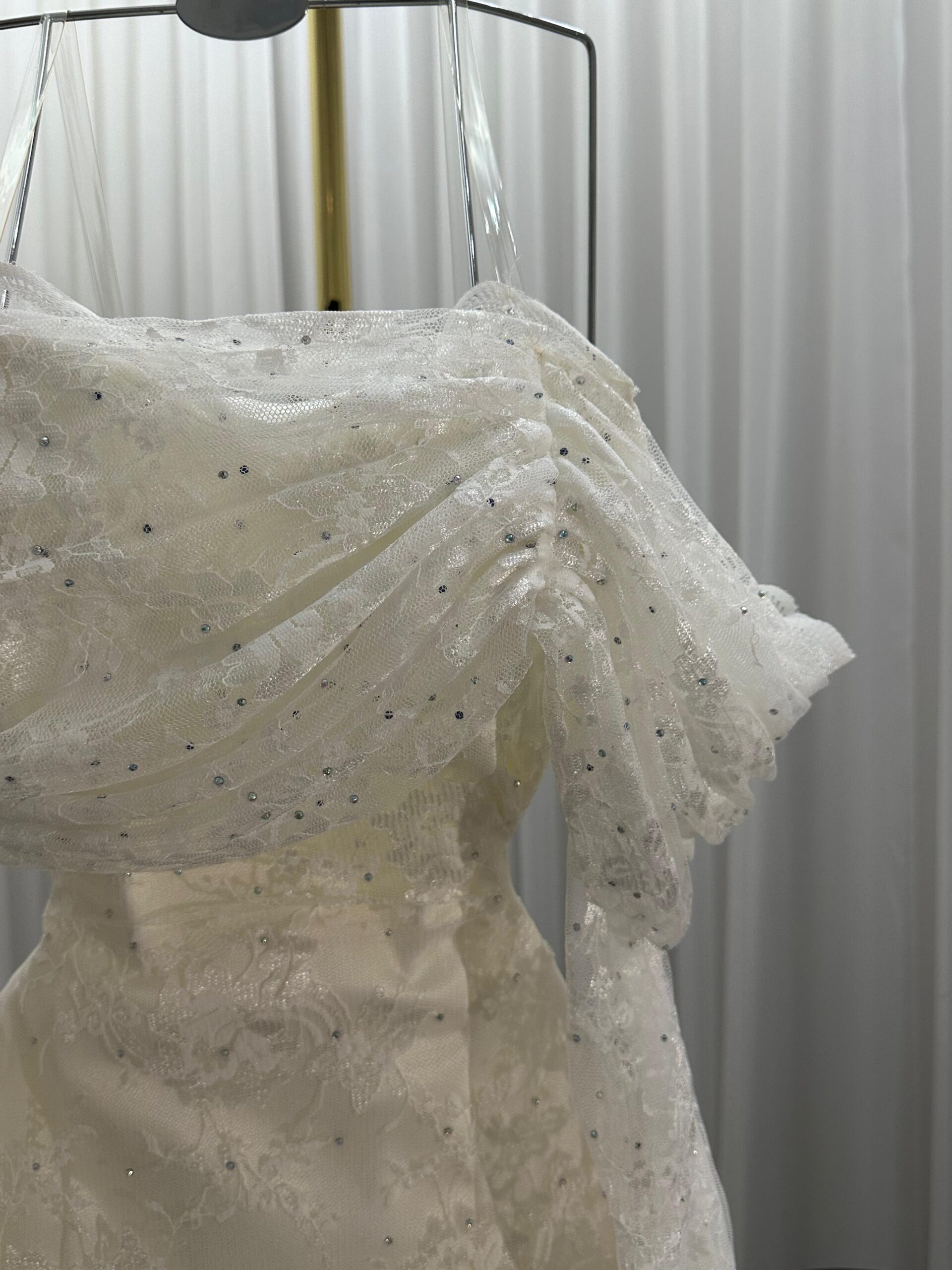 هل تبحثين عن فستان العمر الذي يجمع بين الرقي والجمال؟ إليكِ هذا الفستان الأبيض بتفاصيله الفاخرة وقماشه المزخرف بالدانتيل الناعم. تصميمه الأنيق مع الكتف المنسدل يمنحكِ إطلالة ملكية في ليلة زفافك أو مناسباتك الخاصة.