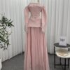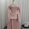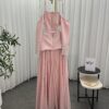 الفستان الوردي هو عنوان الأنوثة والجاذبية، وهذا التصميم العصري يمنحك إطلالة متكاملة للمناسبات الخاصة. يتميز بقصة أوف شولدر ناعمة مع أكمام طويلة مطرزة باللؤلؤ والخرز المتدلي لمزيد من الفخامة. التنورة الشيفون الواسعة تضيف لمسة من الرقي والنعومة، مما يجعله خيارًا مثاليًا للسهرات الفاخرة، وحتى المناسبات