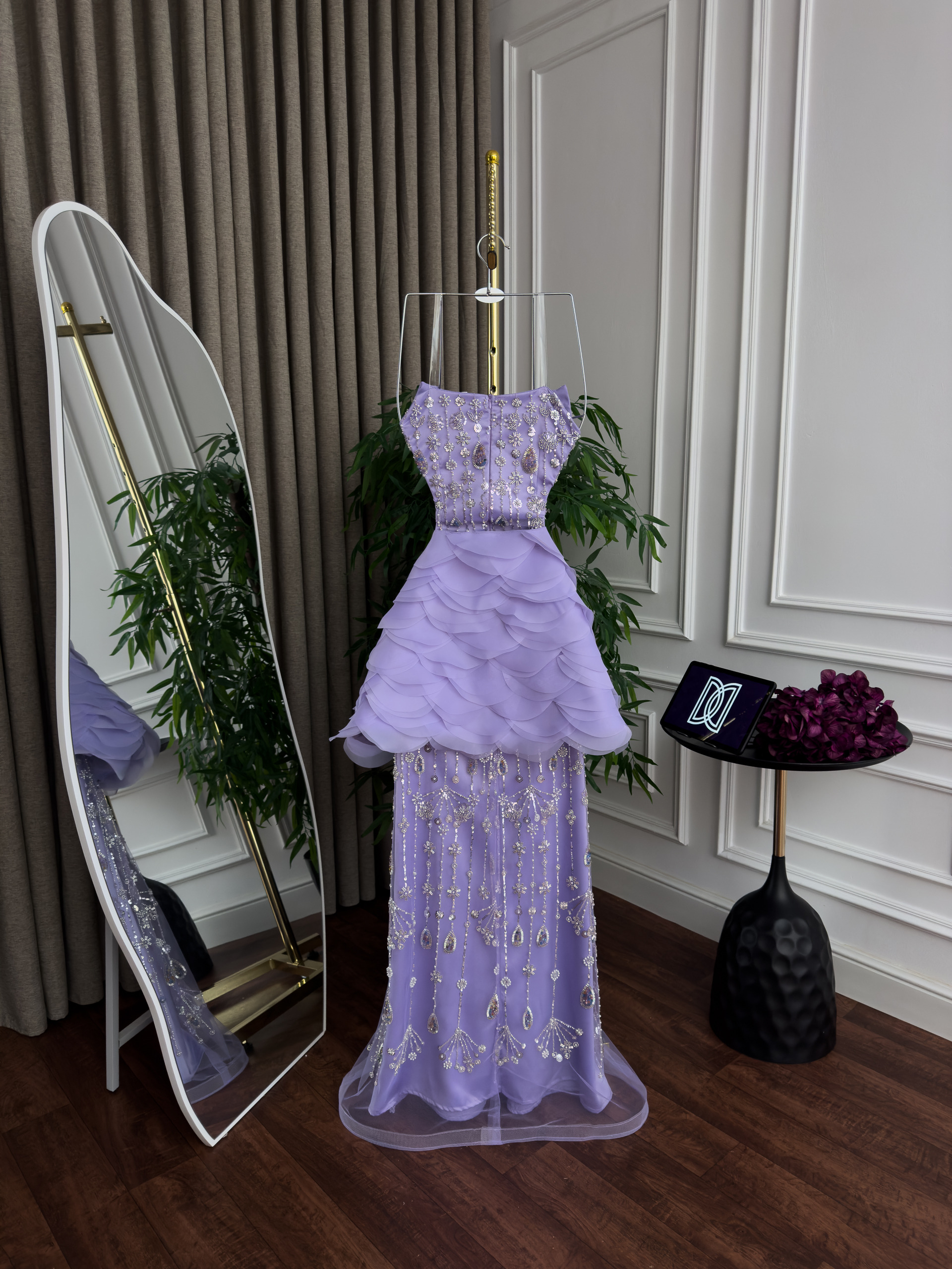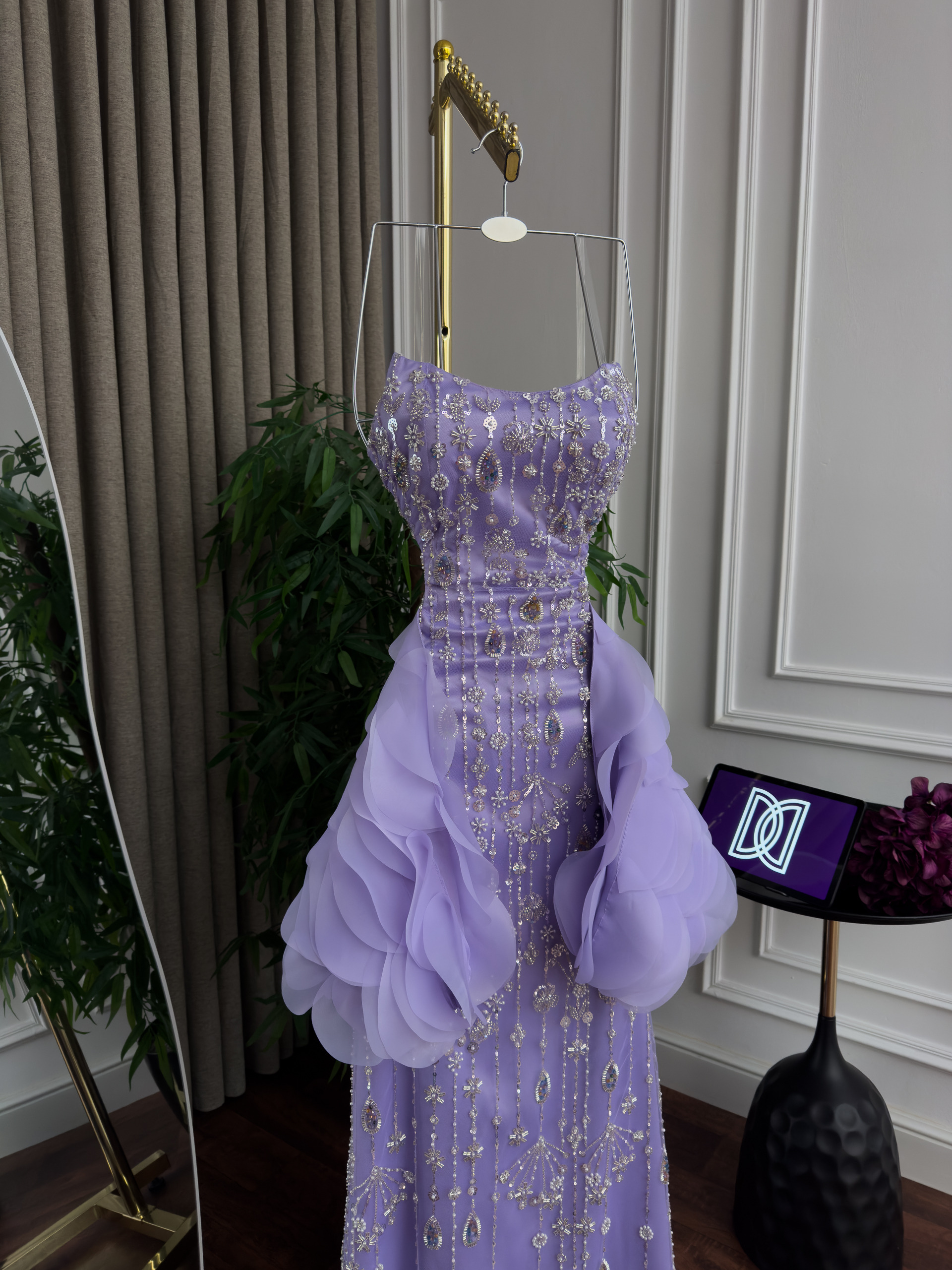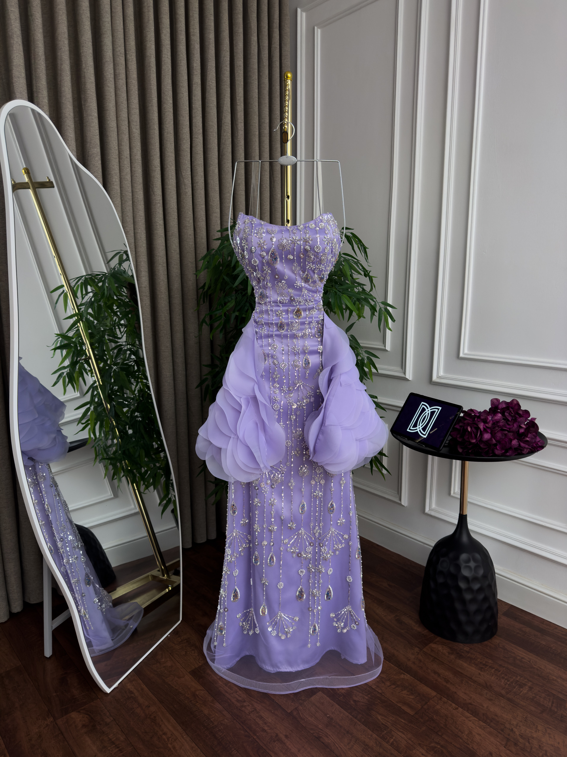 يقدّم متجر روزيتا هذا الفستان الموف الساحر بتصميم فاخر مرصّع بالتطريزات اللامعة والكريستالات المتدلّية التي تضيف لمسة من الفخامة. يتميز الفستان بقصّة ضيقة تبرز جمال القوام مع تفاصيل من الورود الناعمة على الجانبين تمنحه مظهرًا ملكيًا لا يُقاوم.