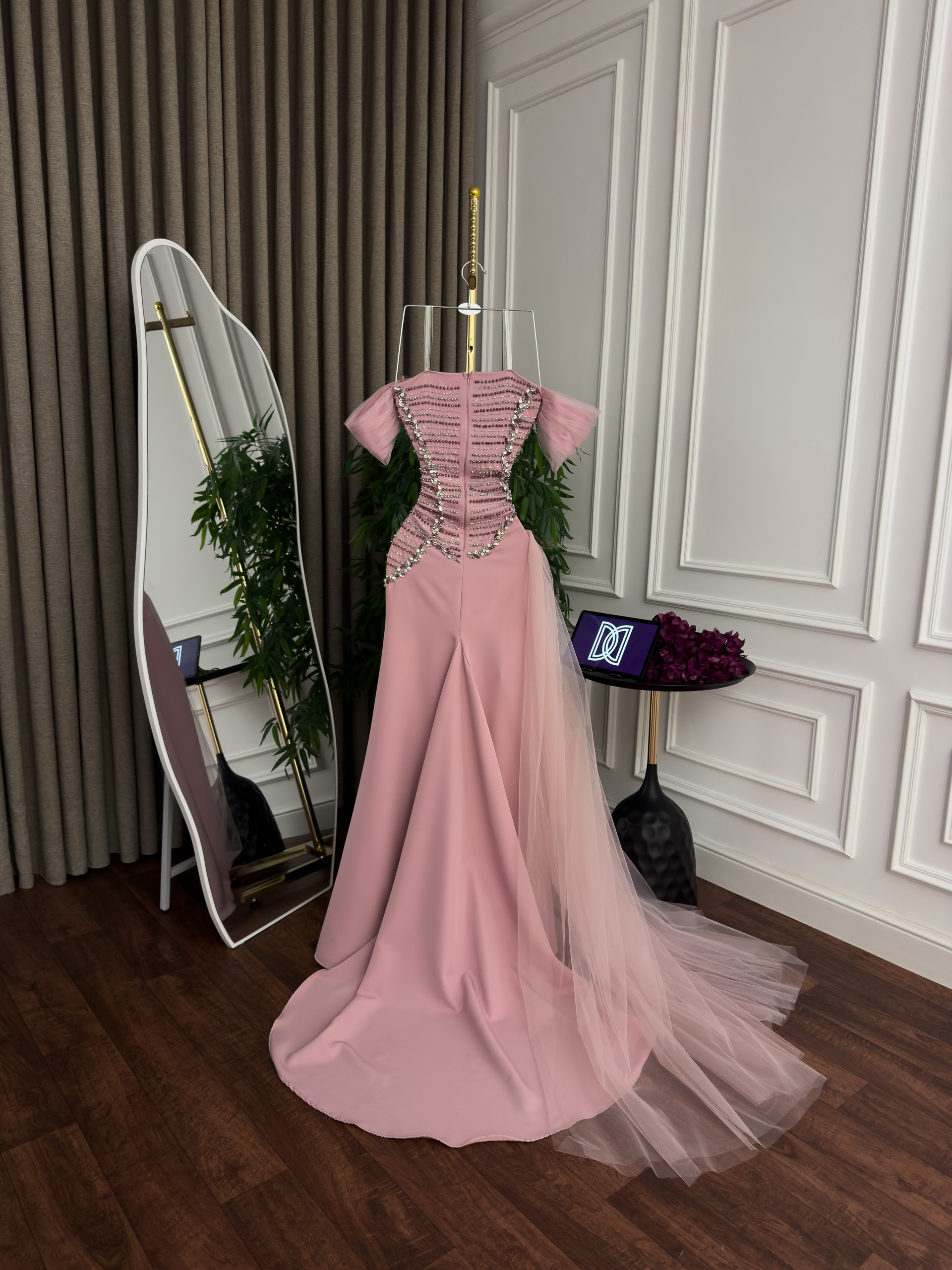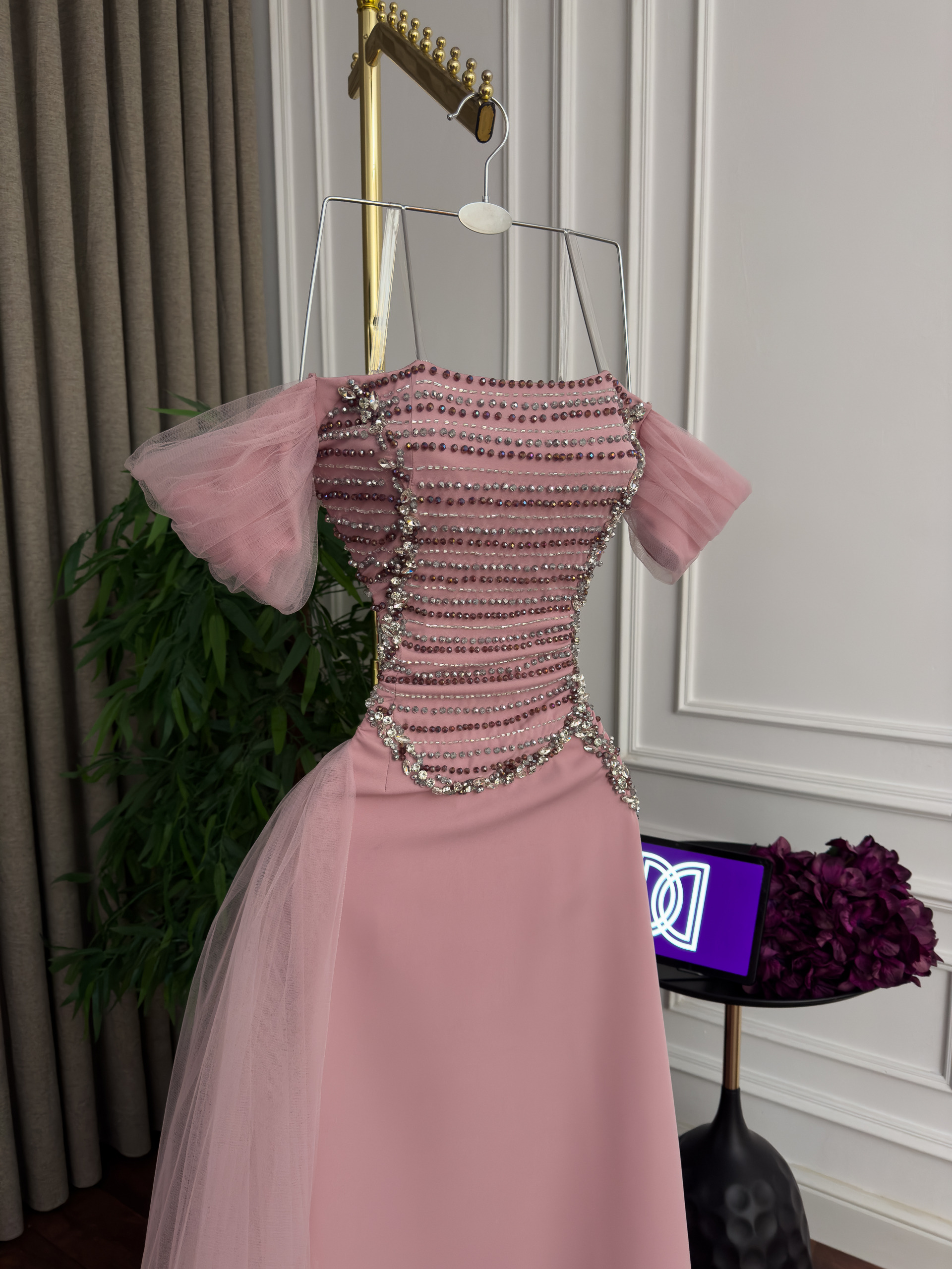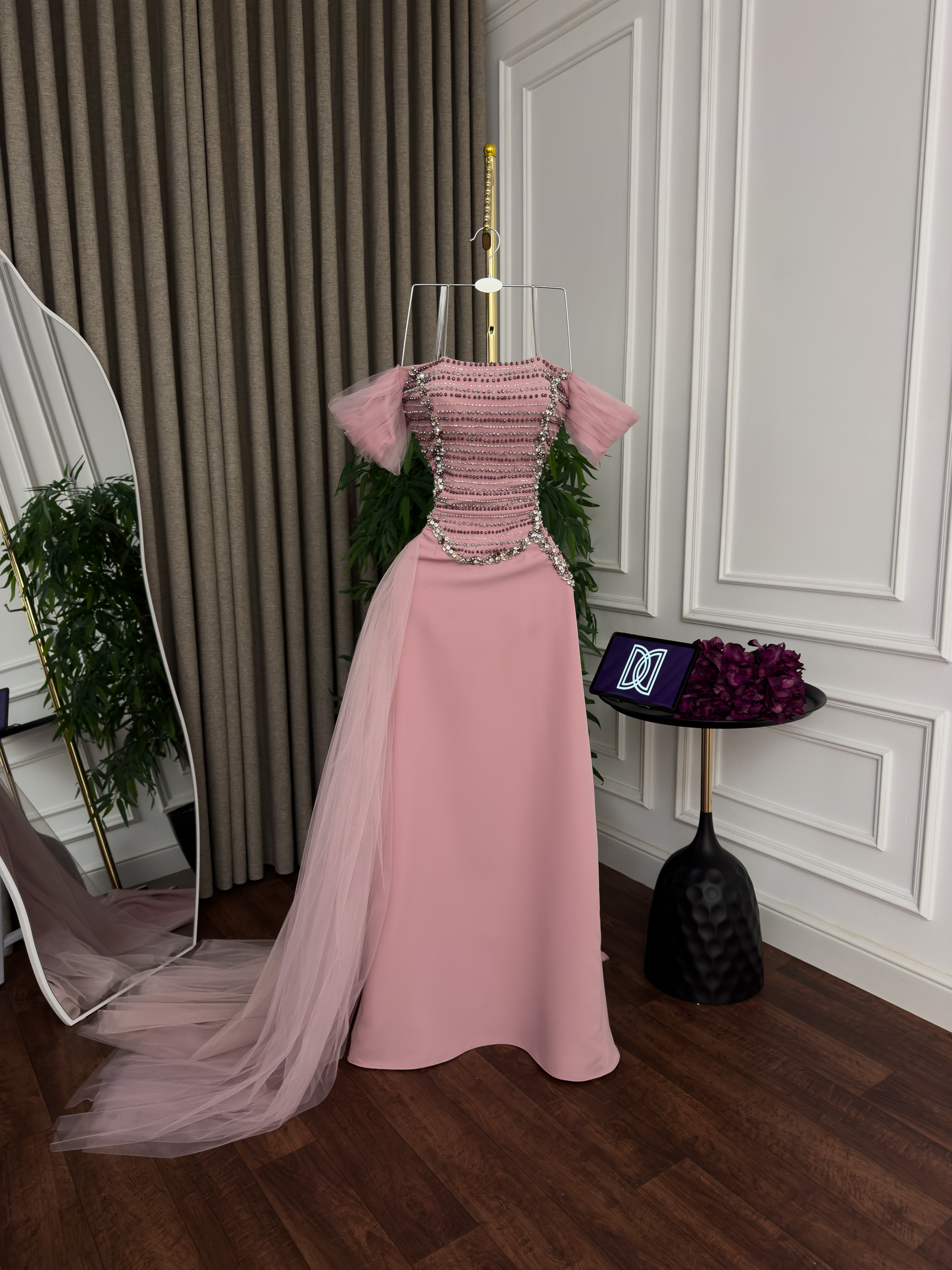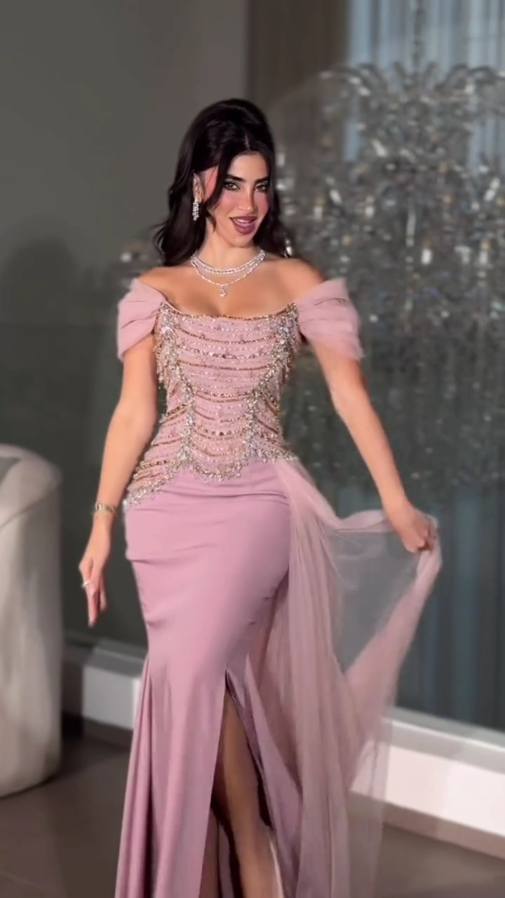 فستان سهرة وردي بلمسات كريستالية