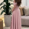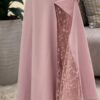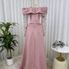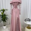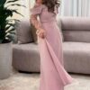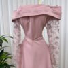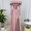 فستان مناسبة أنيق باللون الوردي، مصمم بتفاصيل فاخرة تناسب السهرات والمناسبات الخاصة. يتميز بقصّة أوف شولدر (Off Shoulder) مع أكمام طويلة من الشيفون المطرّز بالورود لإطلالة راقية. التصميم يأتي بقماش ساتان ناعم يمنح مظهراً أنثوياً فخماً، مع فتحة أمامية مزينة بدانتيل شفاف لمسة جريئة تزيد من جاذبية الفستان. مثالي لحفلات الزفاف، الخطوبة، والسهرات الفاخرة.