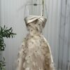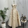 فستان أنيق فاخر ملكي من قماش الساتان الناعم بلمعة راقية. تتميز بصدرية رياضية داخلية لامعة مع تنورة واسعة مزينة بزهور ثلاثية الأبعاد مرصعة بحب لؤلؤ، مما يمنحه لمسة فخامة وأنوثة. مثالية لمناسبات الزفاف والمناسبات ليمنحك إطلالة رائعة ولافتة للأنظار