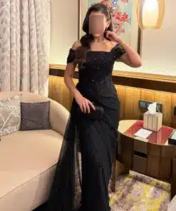 فستان السهرة الأسود – أناقة خالدة مطرزة أوف شولدر وتطريز فاخر