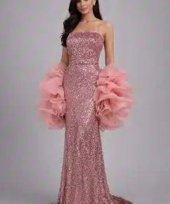 فستان سهرة وردي فاخر لامع بذيل طويل وأكمام أورجنزا فخمة