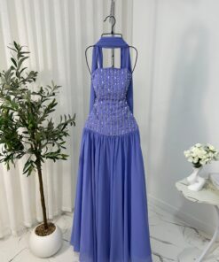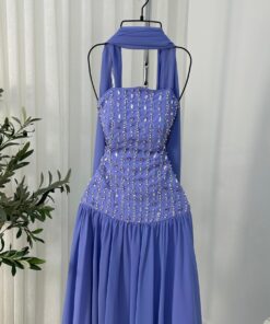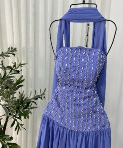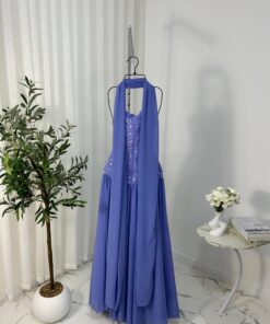 تألقي بإطلالة مبهرة مع هذا الفستان الفاخر المصمم بذوق راقٍ. يتميز الفستان بقصة علوية ضيقة بدون أكمام مع تطريزات لامعة عمودية تضيف لمسة أنثوية جذابة وتبرز القوام بأناقة. الجزء السفلي من الفستان يأتي بقصة واسعة ومنسدلة من الشيفون الناعم، مما يمنحك حرية الحركة وانسيابية ملفتة. كما يكتمل التصميم بشال رقيق ينسدل من الرقبة ليضفي لمسة ملكية ساحرة.