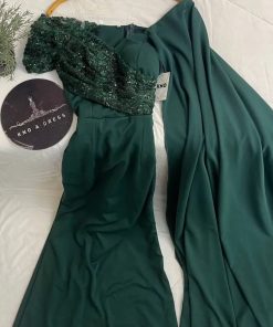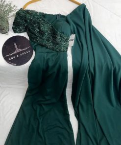 فستان سهرة لكرا كريب راقي مع كلفة مشجرة من الخرز والشك بطريقة راقية