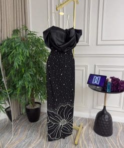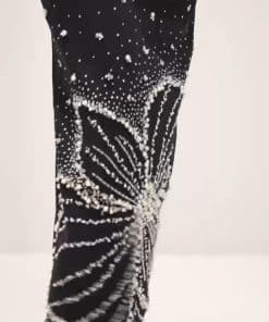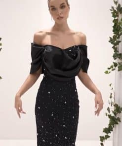فستان سهرة باللون الأسود ومميز. تتميز بقصّة الكتف المكشوفة مع تفاصيل درابية جذابة في الجزء العلوي، مما يضفي لمسة أنثوية رائعة. كما أن بعدات مزين بنقوش هندسية، تتدرج في الأسفل لتشكل رسمًا أنيقًا يشبه الفراشة، مما يضفي لمسة من الفخامة والتألق على الإطلالة.
