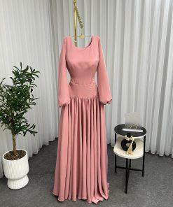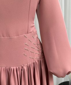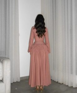 الخصر محدد بدقة ليبرز القوام، وتنورة الفستان طويلة وواسعة بانسيابية جميلة، مما يمنحه مظهراً أنيقاً ومريحاً في الوقت ذاته