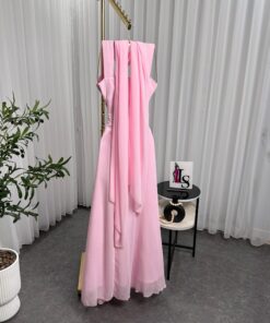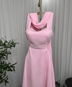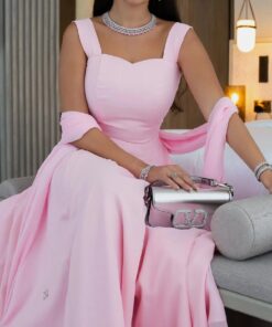 فستان أنيق بلون وردي فاتح، بتصميم كلاسيكي راقٍ. يتميز بقصة صدر مربعة مع حمالات عريضة، ويبدو أنه مصنوع من قماش ناعم وسلس مثل الكريب أو الساتان. الفستان ضيق من الأعلى ويتسع تدريجيًا نحو الأسفل ليشكل تنورة واسعة تعطيه طابعًا فخمًا.