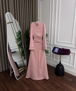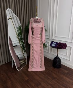الفستان يأتي بلون وردي ناعم، مما يضفي عليه لمسة من الرقة والجمال. الجزء العلوي من الفستان مزين بتفاصيل من الخرز والتطريزات اللامعة التي تضفي بريقًا رائعًا على التصميم. التنورة السلسة تضيف إلى الفستان لمسة من البساطة والجمال، مما يجعله مناسبًا لكل مناسبة خاصة.