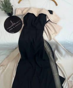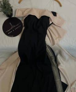 متحور يومي الجديد مع فيونكا وتطريز الكتروني بكريب اسود وتفته بيج بنفشنق عالي