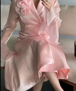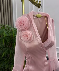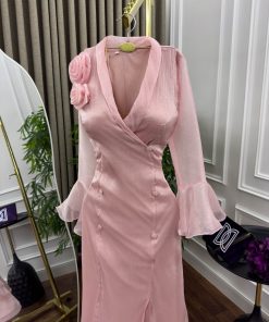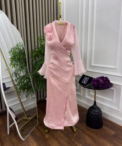 الفستان يتميز بتصميم أنثوي راقٍ باللون الوردي الفاتح مع خامة لامعة تضفي عليه لمسة فاخرة.