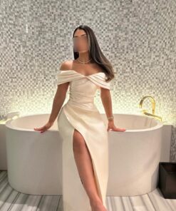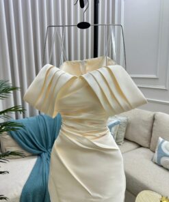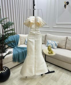 استمتعي بإطلالة ملكية مع هذا الفستان الكريمي الفاخر المصمم بقصة حورية البحر التي تبرز جمال القوام، وتفاصيل الطيات الأنيقة على الكتف لإضافة لمسة من الرقي والفخامة. خيار مثالي للأعراس، حفلات الخطوبة، والمناسبات الراقية لكل سيدة تبحث عن التميز والجاذبية.