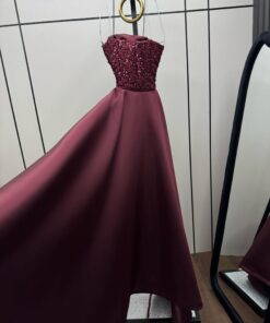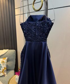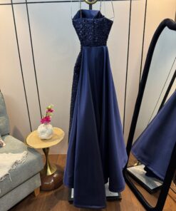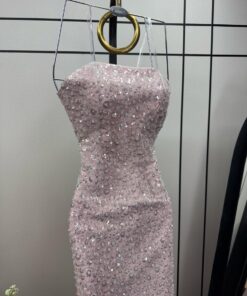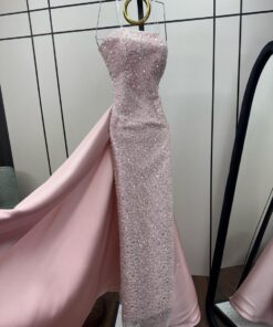 فستان أنيق مصمم بقصة ضيقة تبرز القوام. يتميز بأنه بدون أكمام وبصدر مكشوف، مع تطريزات فاخرة من الخرز والترتر التي تغطي القماش بالكامل، مما يمنحه مظهراً راقياً وبراقاً. يمتد الفستان إلى الأسفل بشكل ضيق حتى الركبتين، ثم ينسدل بذيل خلفي من القماش الناعم، مما يضفي لمسة درامية وجاذبية راقية. تصميمه مثالي للسهرات والمناسبات الفاخرة.
