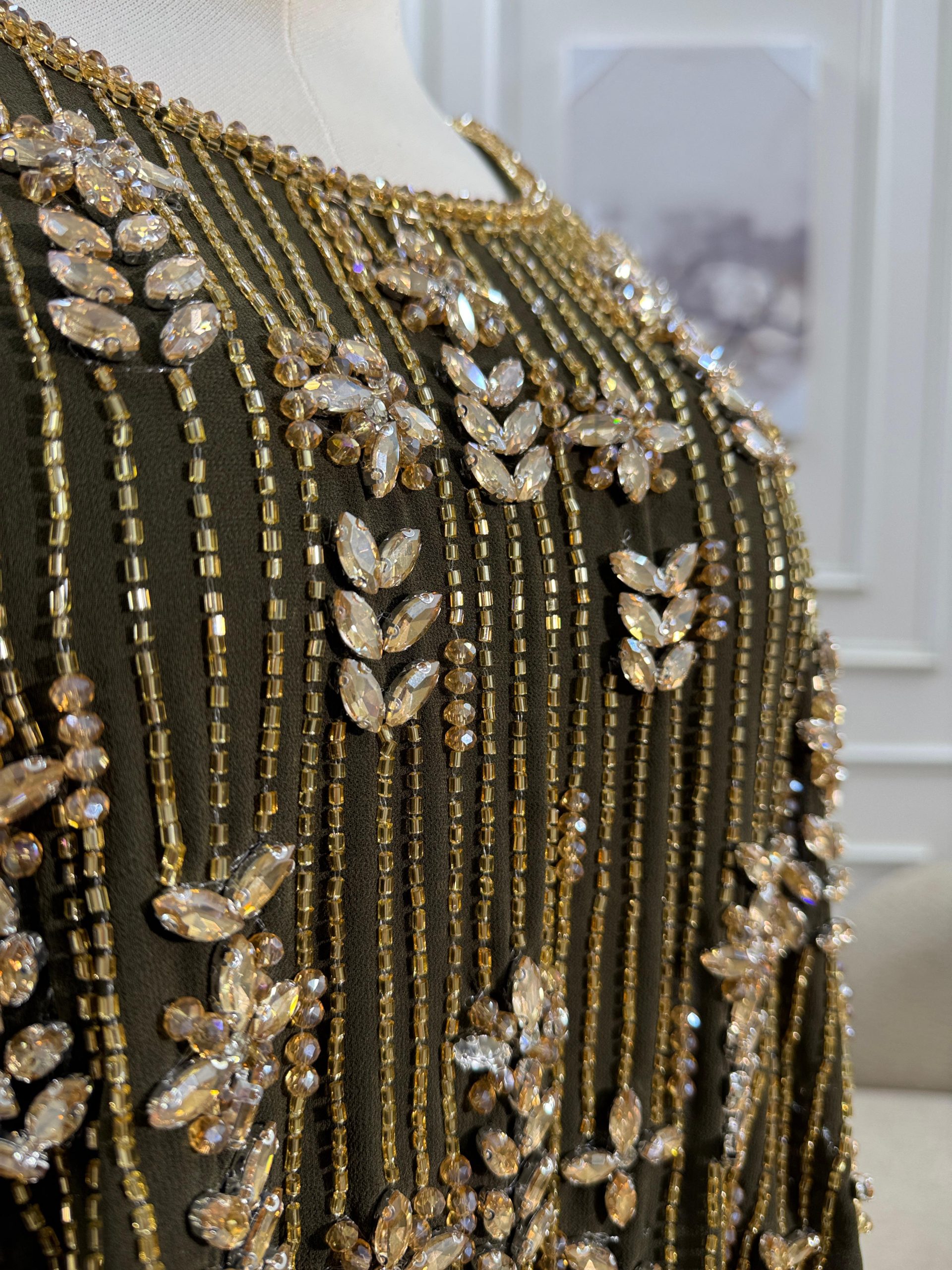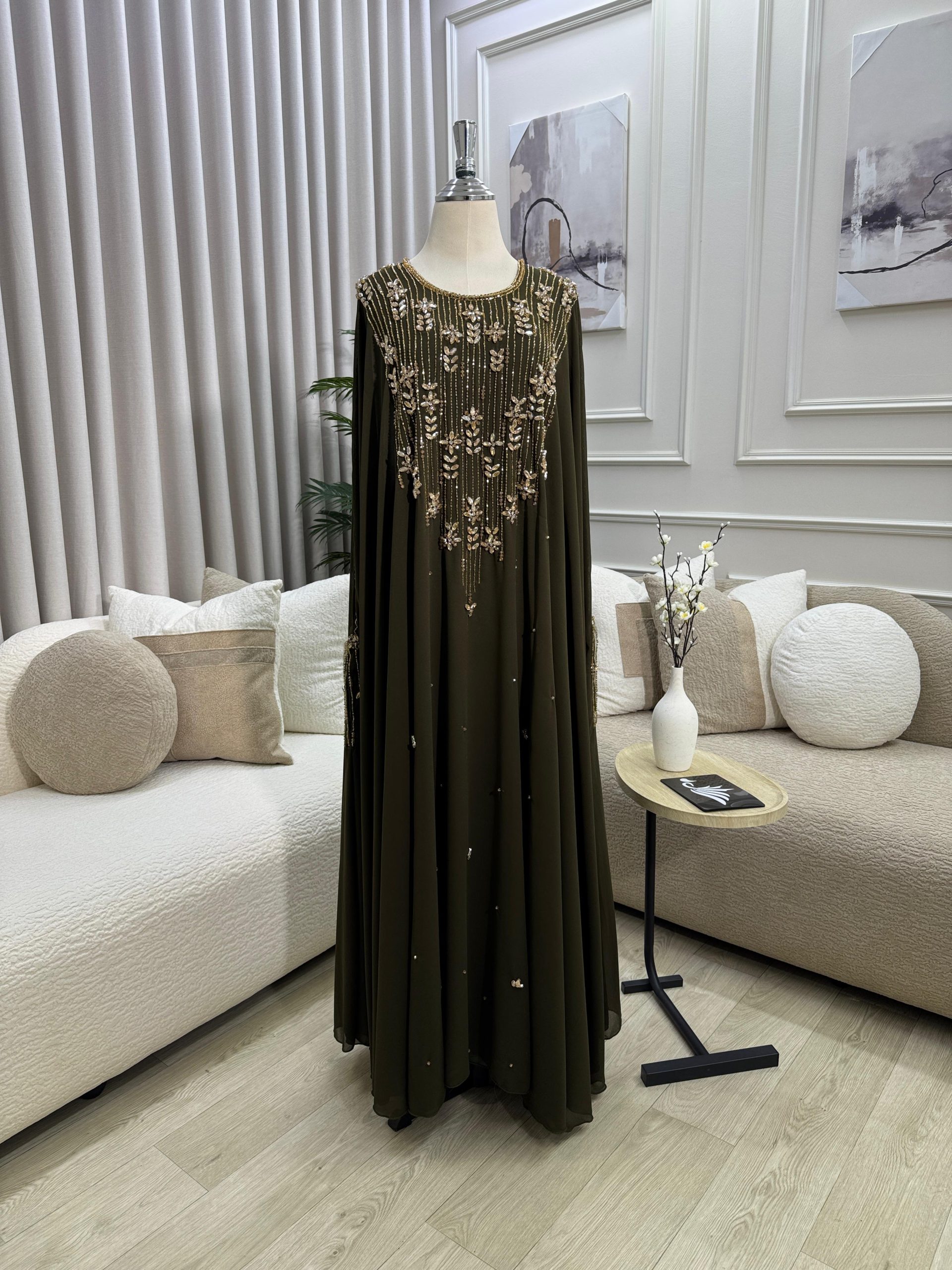 تتميّز الجلابية بتطريز ذهبي أنيق موزّع على الجزء العلوي بتصميم مستوحى من الزخارف الشرقية، ما يضفي لمسة فاخرة دون مبالغة ويمنح القطعة حضورًا راقيًا.