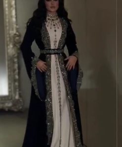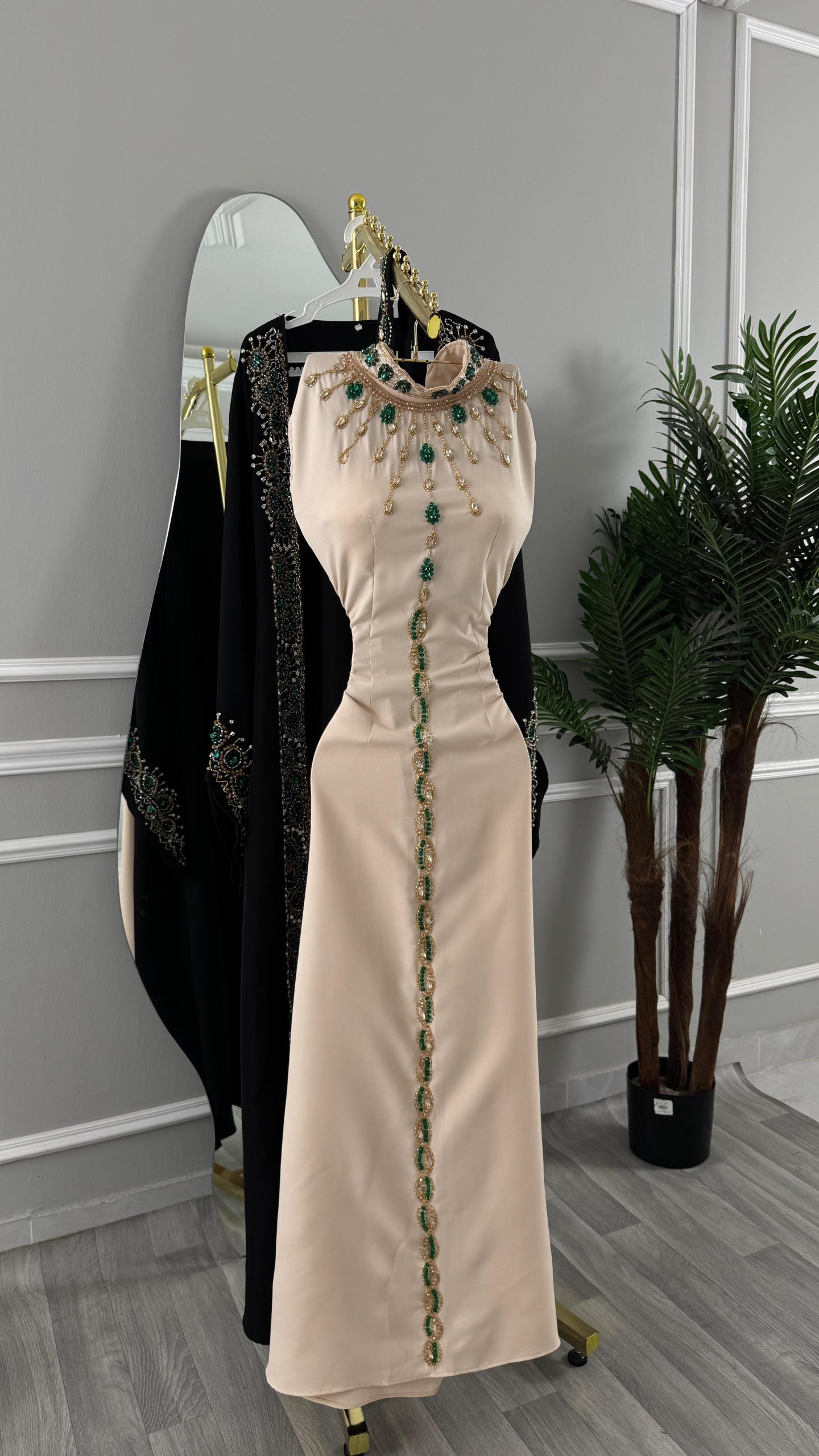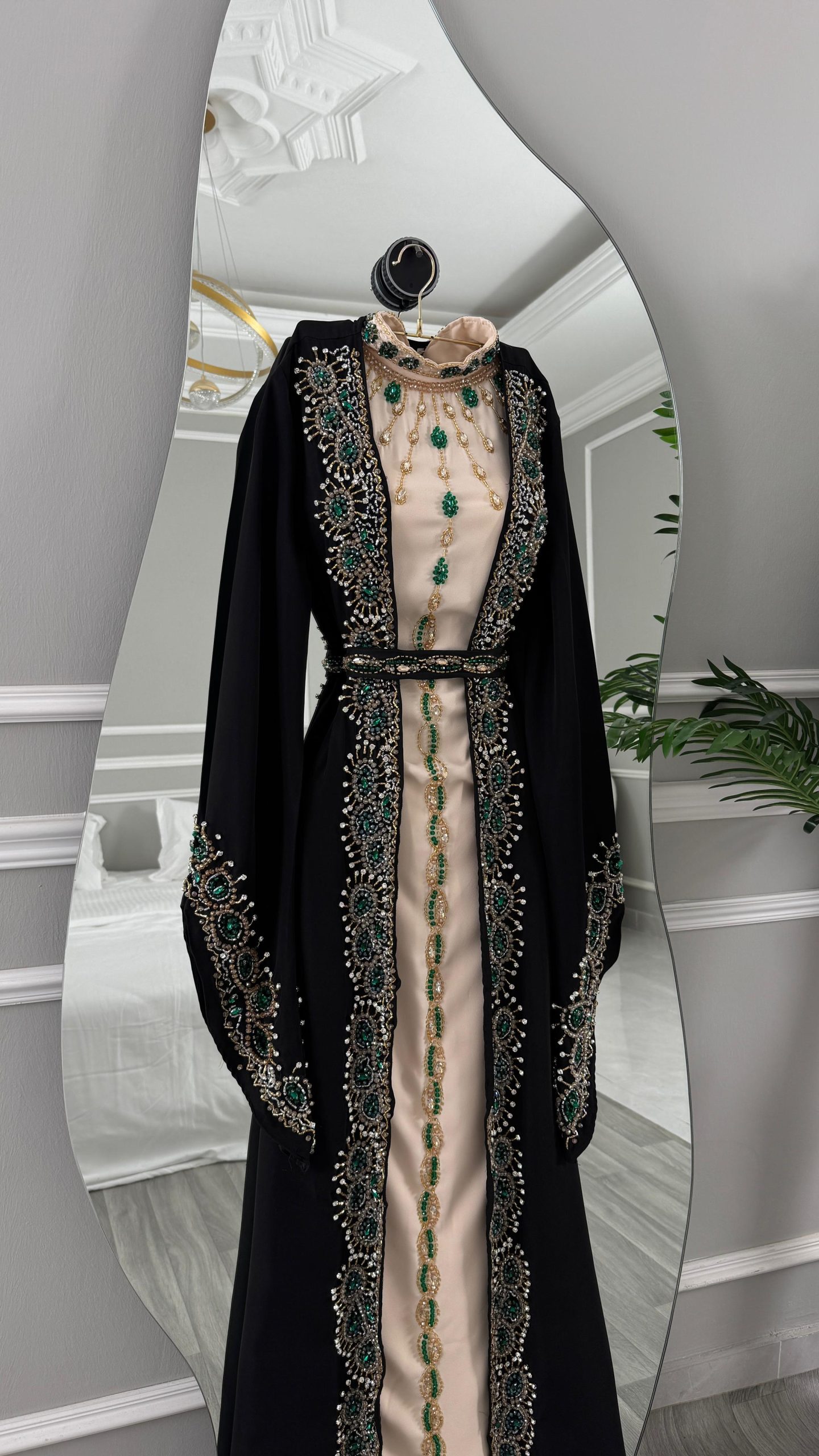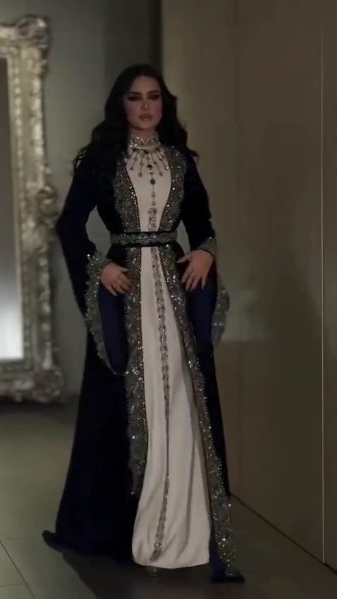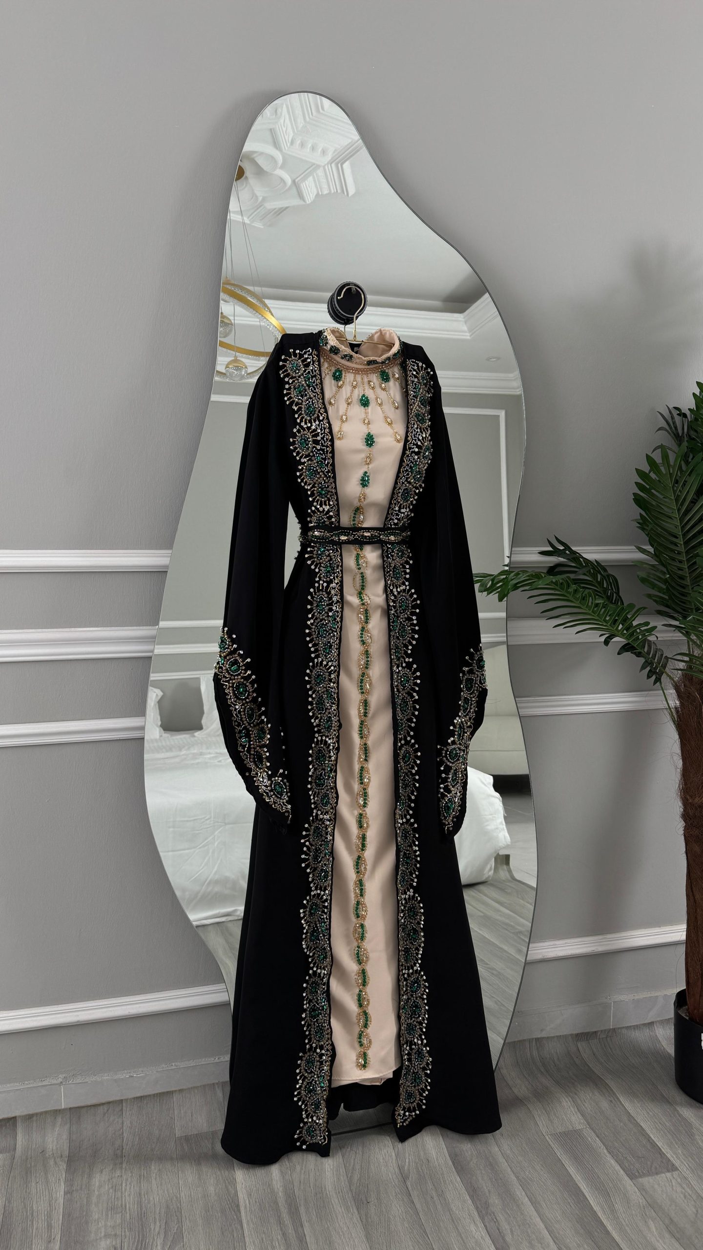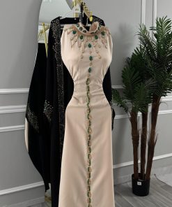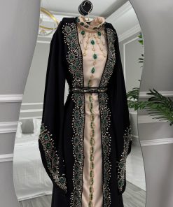 جلابية راقية بتصميم فاخر يجمع بين الأناقة الشرقية والفخامة العصرية، مصنوعة باللون الأسود الكلاسيكي مع بطانة بلون بيج ناعم. تتميز بتطريز يدوي فاخر بدرجات الأخضر والذهبي على الصدر والأكمام والحواف الأمامية، مع تفاصيل راقية تعكس طابعًا ملكيًا وإطلالة مميزة للمناسبات الخاصة والاحتفالات الراقية.