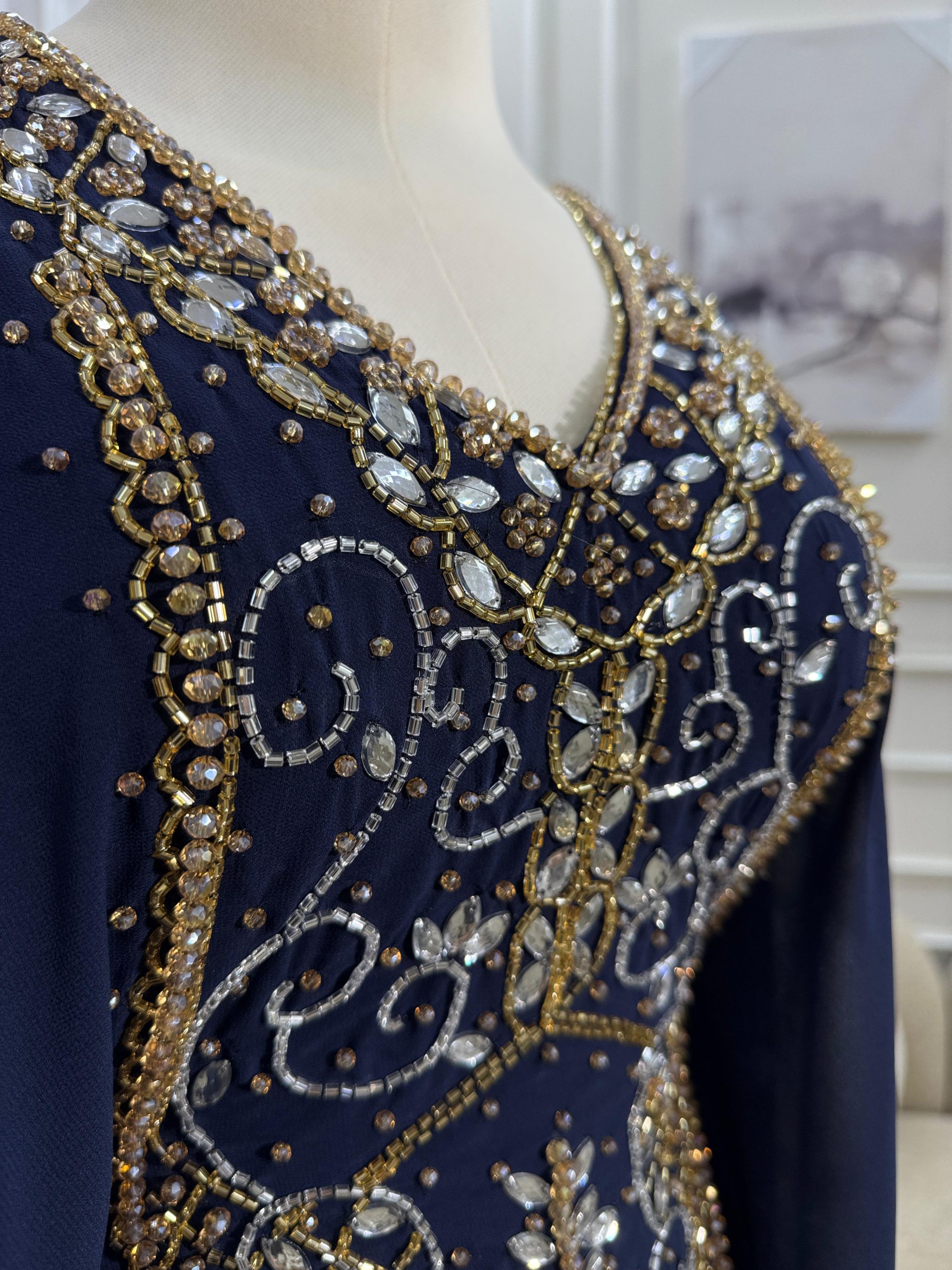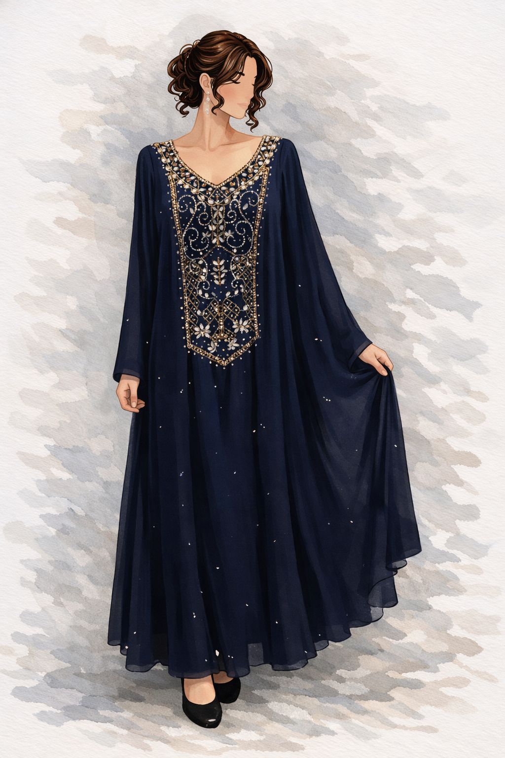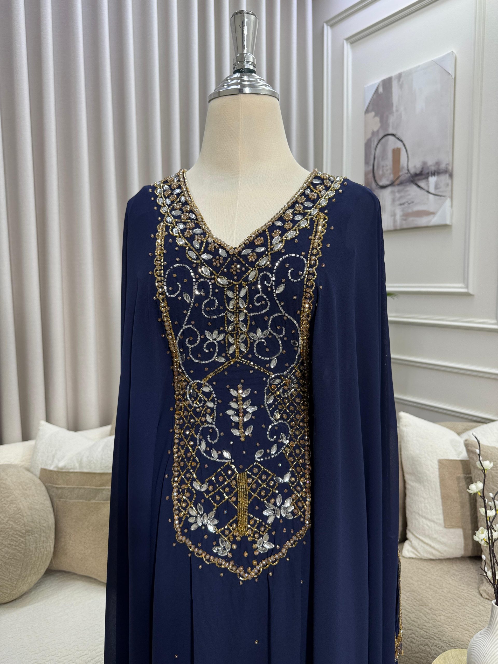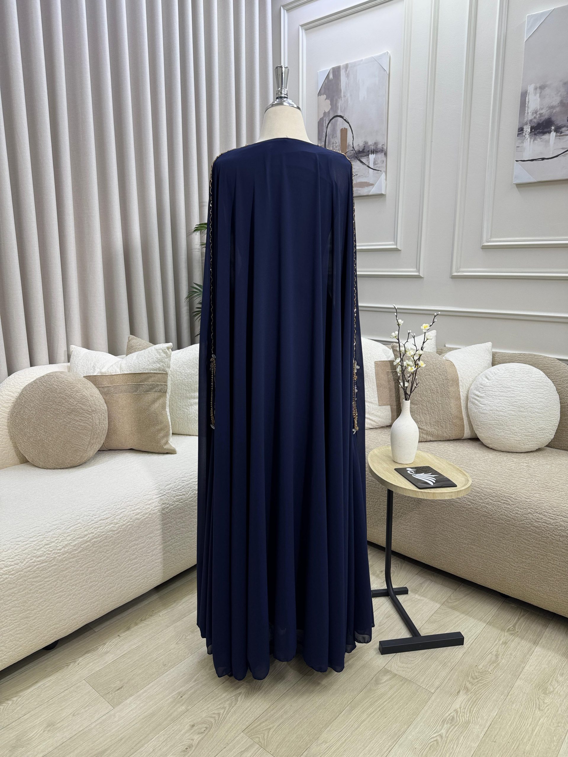 مصنوعة من قماش شيفون ناعم وخفيف بقصة واسعة وانسيابية تمنحك الراحة طوال اليوم، مع أكمام طويلة مناسبة للمناسبات الرسمية والتجمعات العائلية والسهرات الخاصة. اللون الكحلي العميق يجعلها خيارًا مثاليًا للمرأة الباحثة عن الأناقة الهادئة.