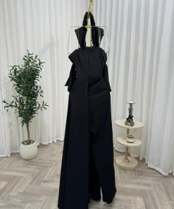 يأتي الجمبسوت باللون الأسود الكلاسيكي الذي يعكس الأناقة والقوة، مع تطريزات عنابية لامعة تضيف لمسة فخامة جذابة وتبرز التصميم بأسلوب راقٍ يناسب السهرات المسائية.