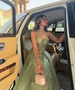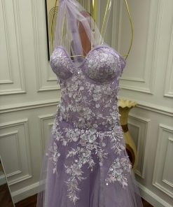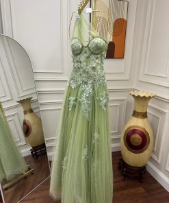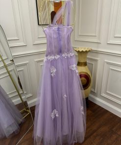 فستان سهرة طويل ، مصنوع من قماش التل الرقيق، ومزود بتفاصيل أنيقة مثل الزهور المطرزة على الصدر والتنورة. التصميم يبدو أنيقًا وفاخرًا، حيث يحتوي على فتحة عند الساق لإضافة لمسة من الجاذبية. الفستان يتميز بقصة صدر ضيقة بحمالات رفيعة، ما يبرز جمال الخصر والجزء العلوي بشكل رائع