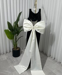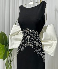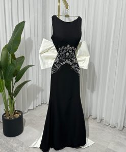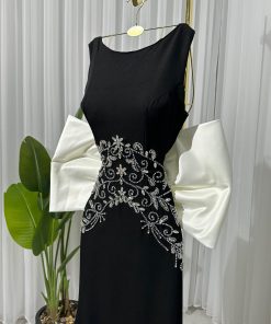 فستان اسود بتطريز يدوي على القماش وفيونكه من الخلف 🎀🤍!