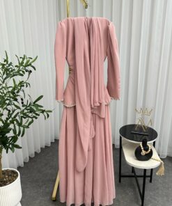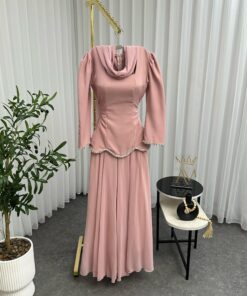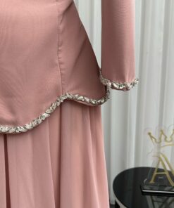 فستان أنيق ورومانسي بلون وردي فاتح، مصنوع من قماش انسيابي يمنحه مظهرًا راقيًا. يتميز بقصة ضيقة عند الخصر تعزز جمال القوام، مع أكمام طويلة ومنتفخة عند الأكتاف لإضافة لمسة كلاسيكية.