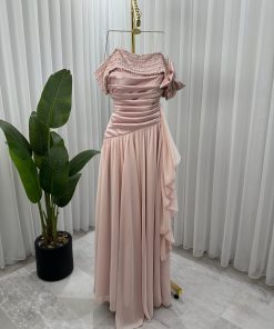 فستان أبيض طويل مصنوع من القماش الناعم مما يمنح مظهرًا انسيابيًا. يتميز الجزء العلوي بكتف مكشوف ومزين بتفاصيل براقة عند الصدرية وحزام الكتف،